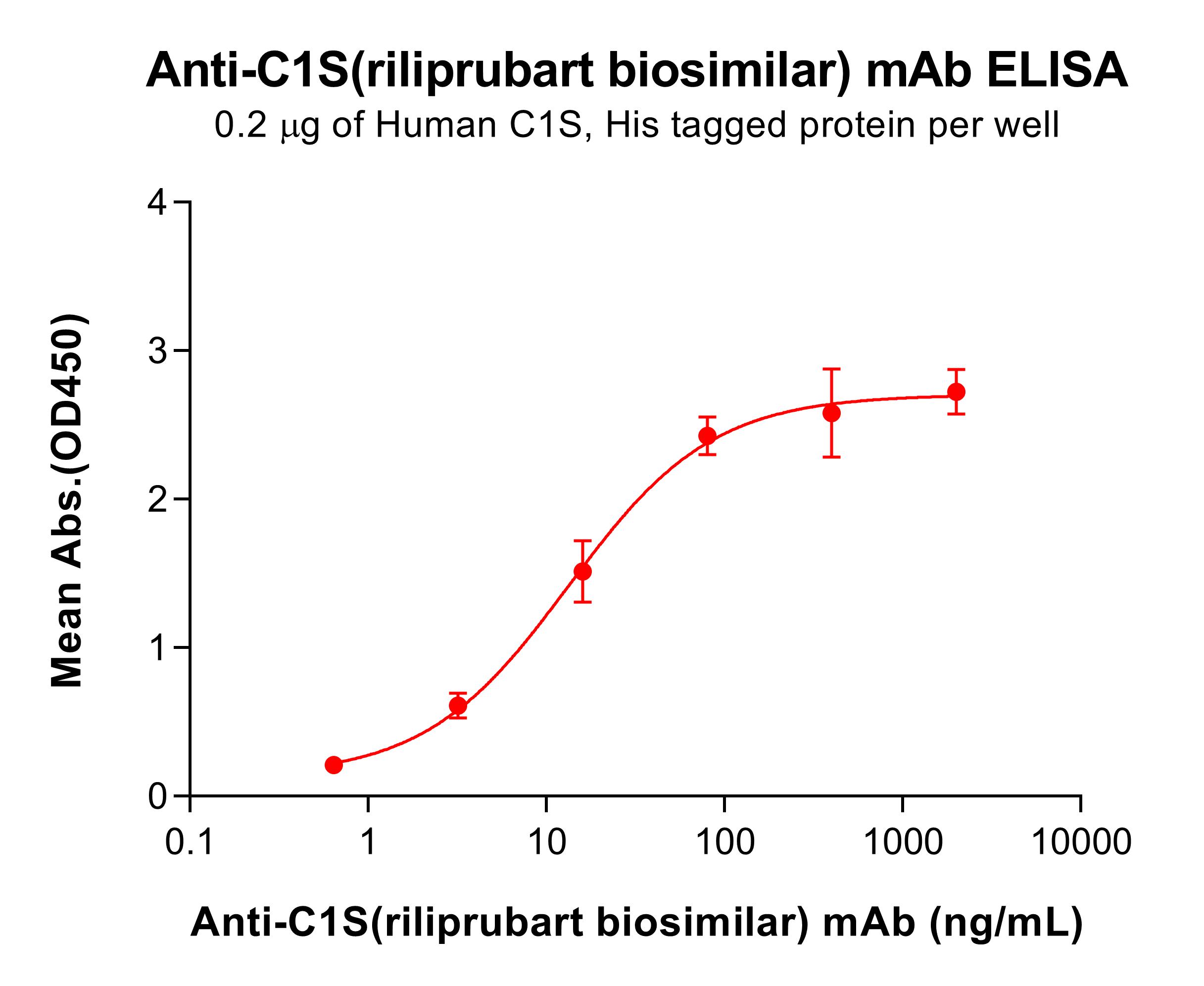 Figure 1. ELISA plate pre-coated by 2 μg/mL (100 μL/well) Human C1S Protein, His Tag (PME101394) can bind Anti-C1S(riliprubart biosimilar) mAb (BME100649) in a linear range of 3.2–16 ng/mL.