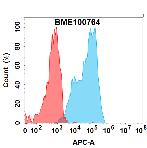 Figure 1. Flow cytometry analysis with 0.5 μg/mL Anti-IL22RA1(temtokibart biosimilar) mAb (BME100764) on HEK293 cells transfected with Human IL22RA1 protein (Blue histogram) or HEK293 transfected with irrelevant protein (Red histogram).