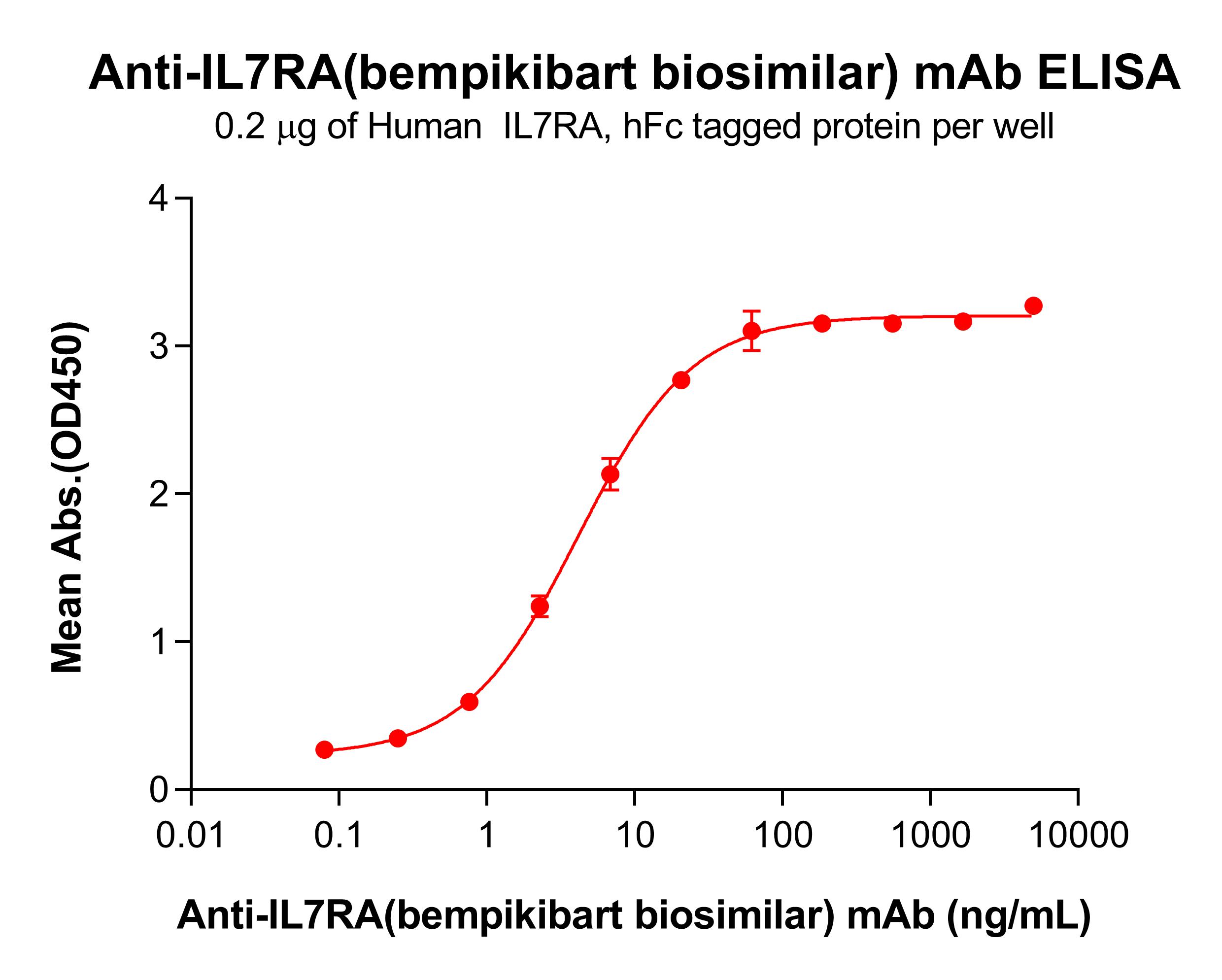 Figure 1. ELISA plate pre-coated by 2 μg/mL (100 μL/well) Human IL7RA Protein, hFc Tag (PME100840) can bind Anti-IL7RA(bempikibart biosimilar) mAb (BME100428) in a linear range of 0.76–20.58 ng/mL.