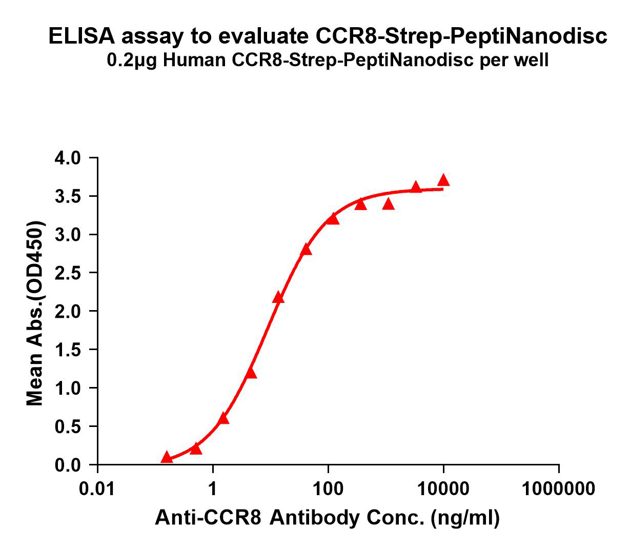 Figure 1. Elisa plates were pre-coated with C-Flag&Strep Tag CCR8-Strep-PeptiNanodisc (0.2μg/per well). Serial diluted anti-CCR8 monoclonal antibody (BME100115) solutions were added, washed, and incubated with secondary antibody before Elisa reading. From above data, the EC50 for anti-CCR8 monoclonal antibody binding with CCR8-Strep-PeptiNanodisc is 8.941ng/ml.